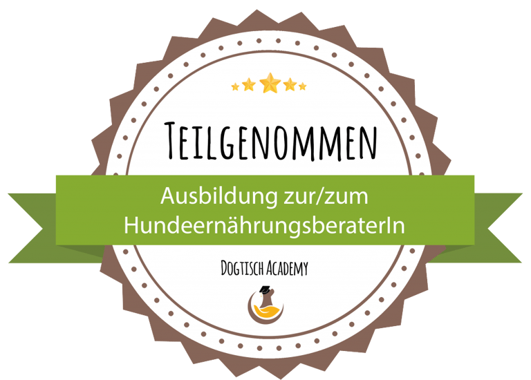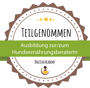 Im Mai 2024 habe ich meine Ausbildung zur zertifizierten Ernährungsberaterin für Hunde an der renommierten Dogtisch Academy erfolgreich abgeschlossen.